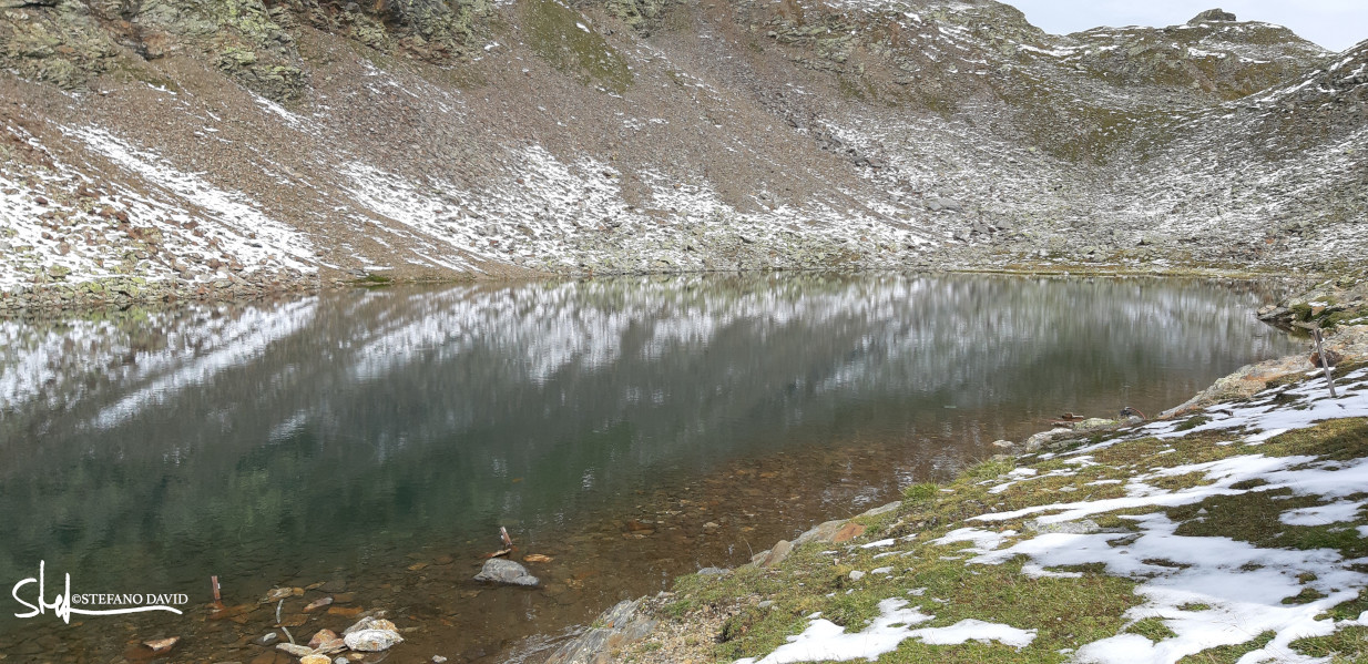 Poco più in alto della forcella, un placido laghetto alpino. Vicino al lago, una costruzione abbandonata, diroccata e mai entrata in uso. Tutt’intorno solo rocce, sfasciumi, pietraie, licheni, ciuffi d’erba e qualche raro stambecco che pascola con quel poco che trova.